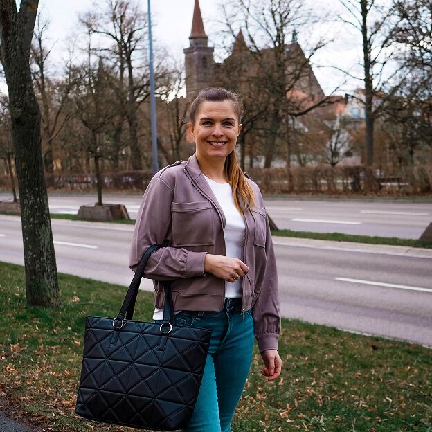 Marta rundet ihren Look mit der farblich passenden Tasche ab. Dazu eine helle Jeans und ein weißes T-Shirt und schon ist man auch für regnerische Frühlingstage gerüstet.